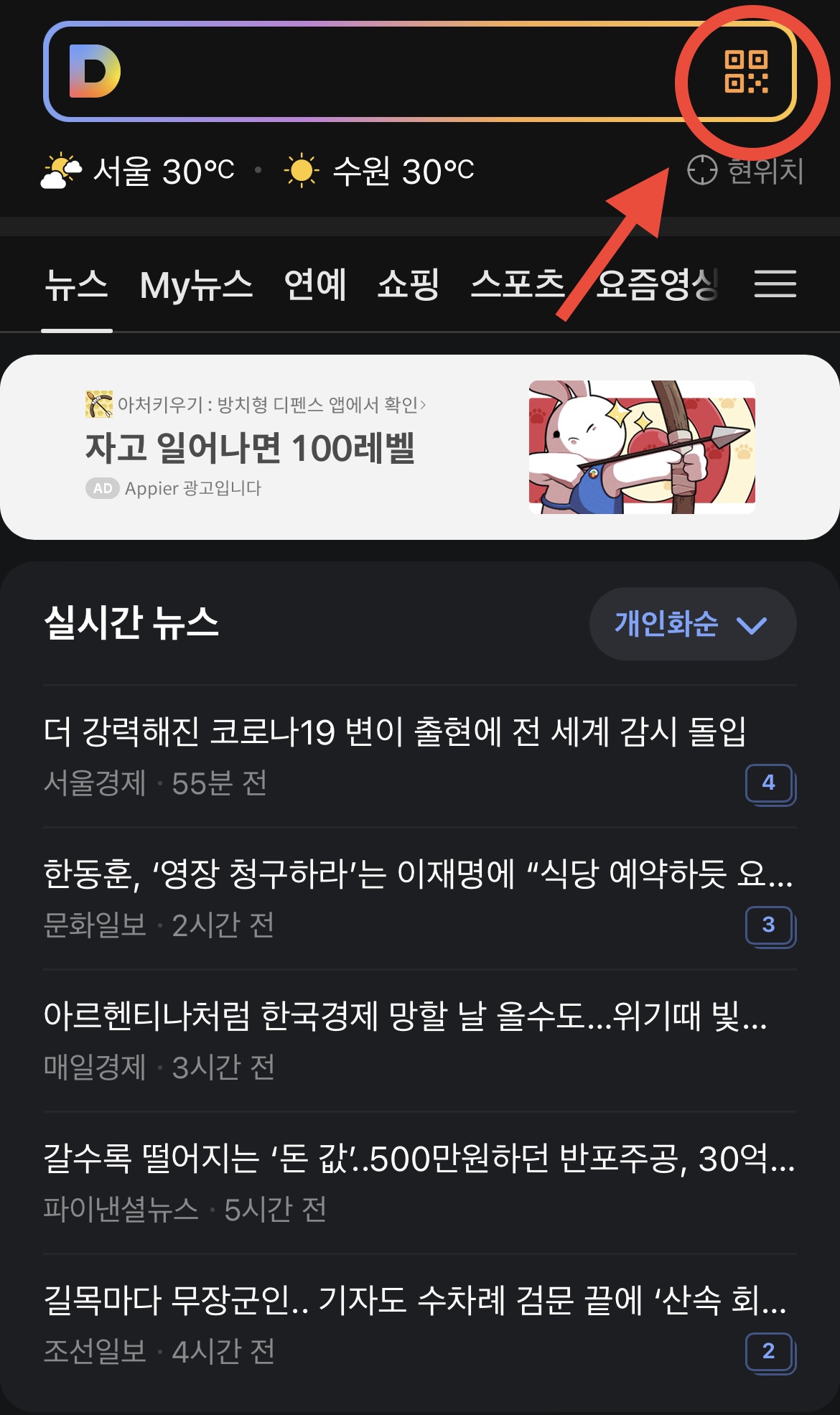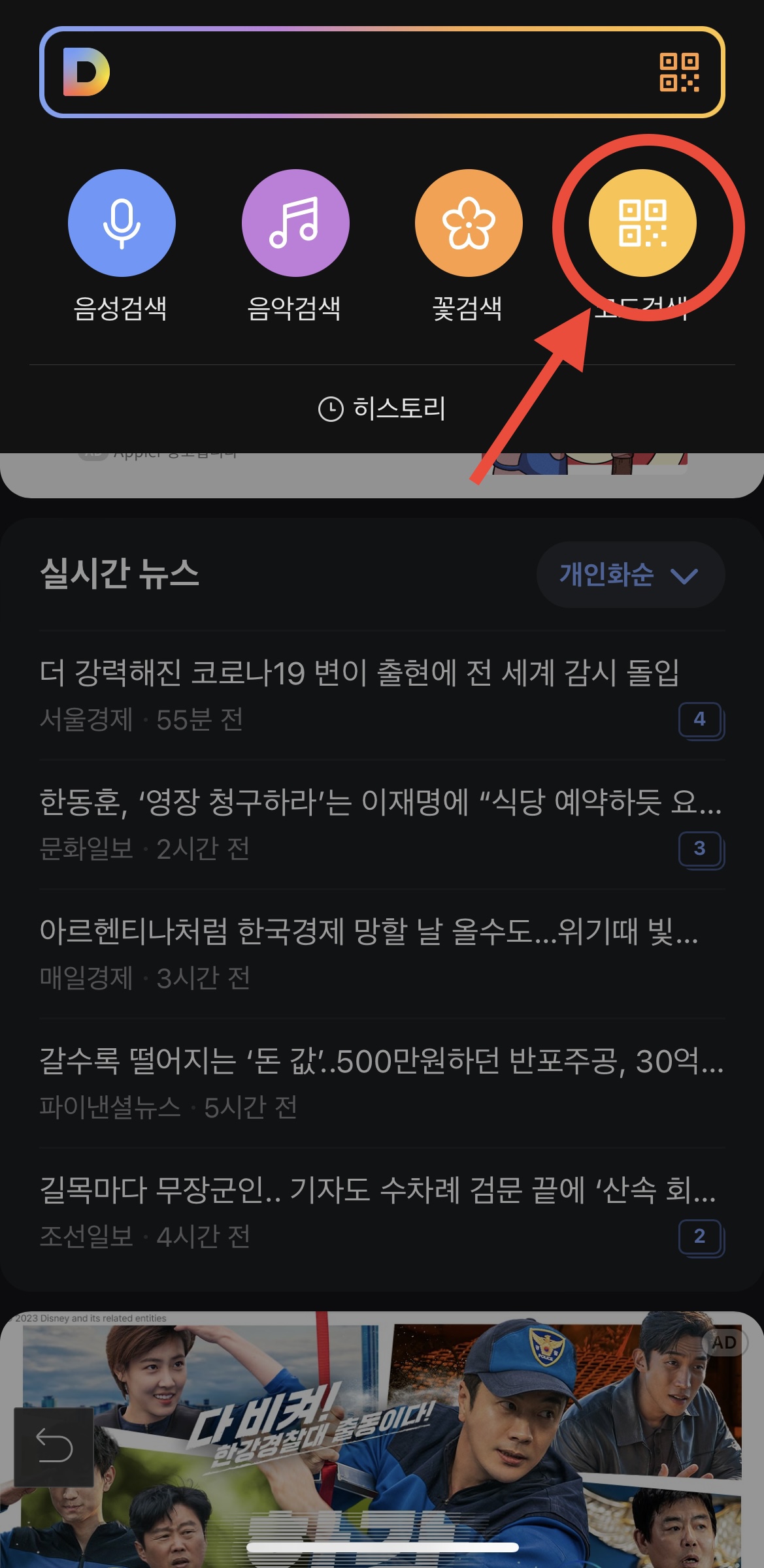 다음 검색창 옆에 모양을 클릭해 주세요 코드검색을 눌러주신 후 OR코드를 인증해서 당첨사실을 확인하시기 바랍니다