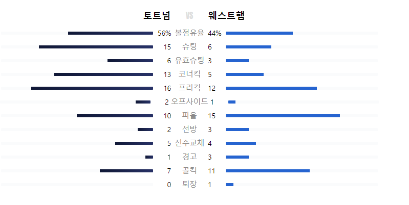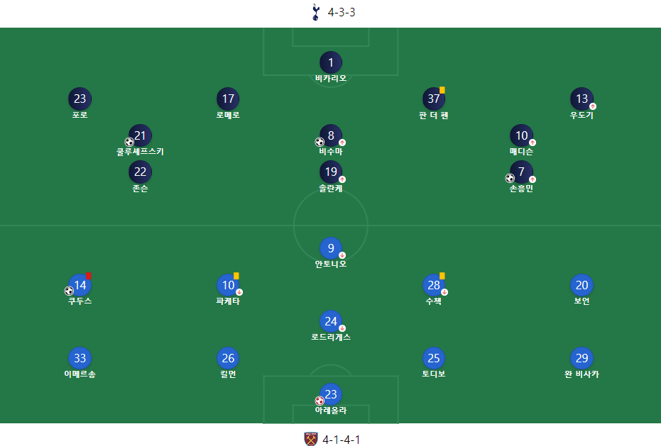 토트넘은 36분 쿨루셰프키가 첫골을 득점하였으며, 52분 비수마,웨스트햄의 선수가 55분 아레올라(자책골)을 넣으면 토트넘의 1골을 추가 했습니다. 60분 손흥민선수가 골을 넣었습니다.