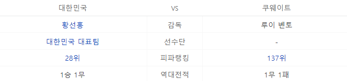 대한민국은 피파랭킹 28위 이며 역대 전적 1승 1무의 기록을 가지고 있습니다. 상대팀이 쿠웨이트는 피파랭킹137위 역대전적 1무 1패의 기록을 가지고 있습니다.