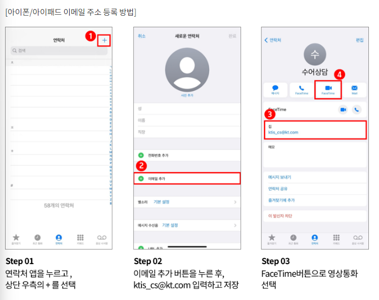 | 이용방법 | 아이휴대폰/패드/인터넷전화에서 010-2917-8371 + 영상통화 아이폰/아이패드에서 연락처에 ktis_cs@kt.com 이메일 등록 + Face Time *메일주소는 시각장애인 영상통화 전용으로 이메일을 통한 상담은 진행하지 않습니다. |