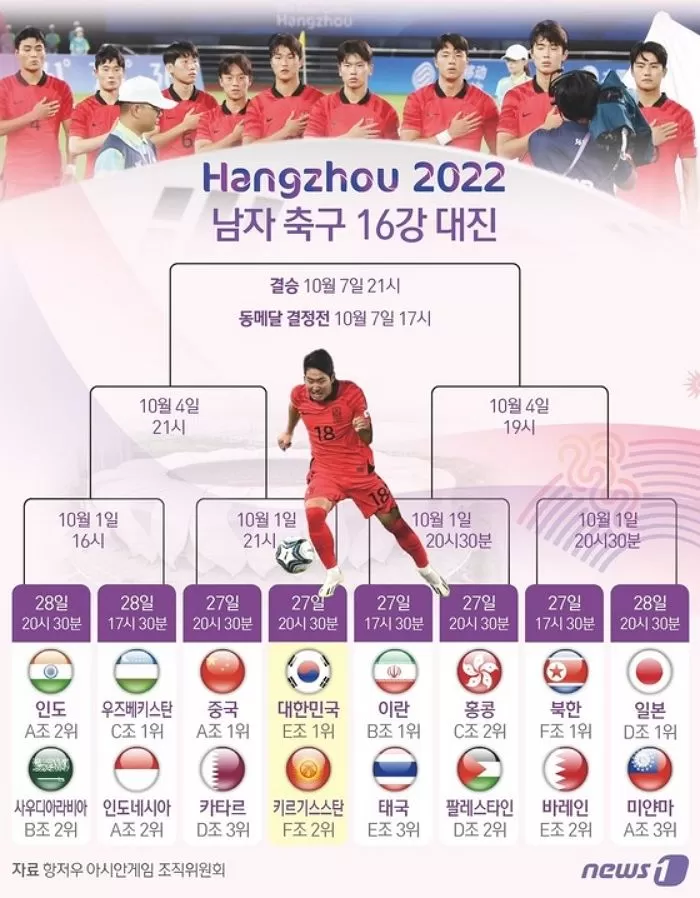 대한민국 대표팀은 9월27일 오후 8:30분 대한민군vs키르기스스탄관 16강 경기를 진행합니다. 중국과카타드도 같은 날 같은시간대에 16강 경기를 치르게된다. 이긴 두팀은 8강전을 치르게 된다