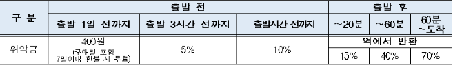 | 출발 1일전까지 | 출발 1시간 전까지 | 출발 1시간 전~ 출발시간 전까지 | ~20분 | ~60분 | 60분~도착 | |